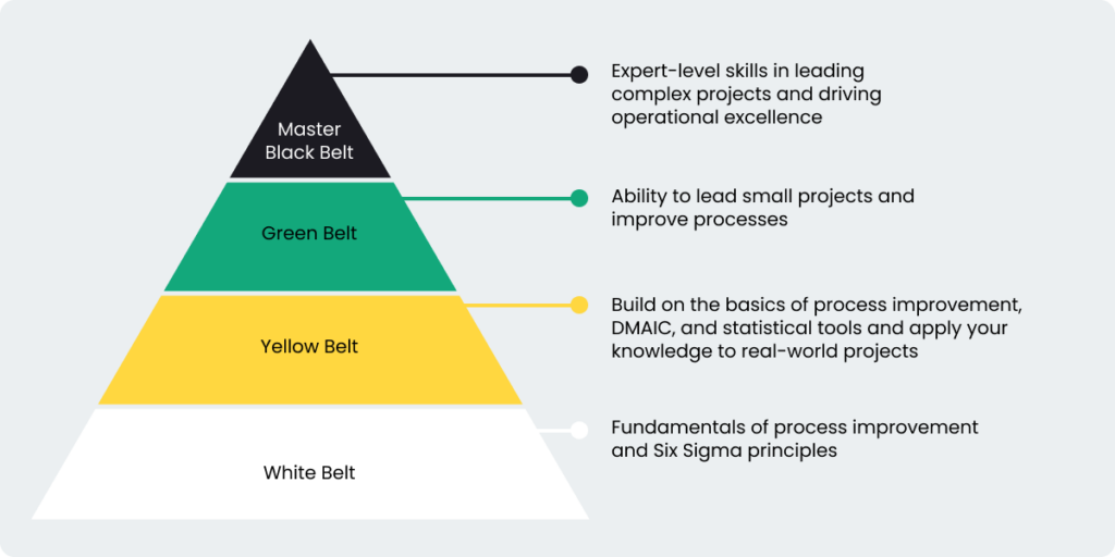 Six Sigma certifications follow a structured belt system, similar to martial arts, indicating different levels of expertise: