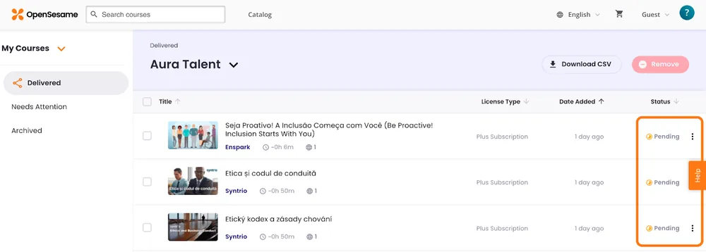 - Pending: The course has been selected by the learning admin but has not been added to their platform catalog yet