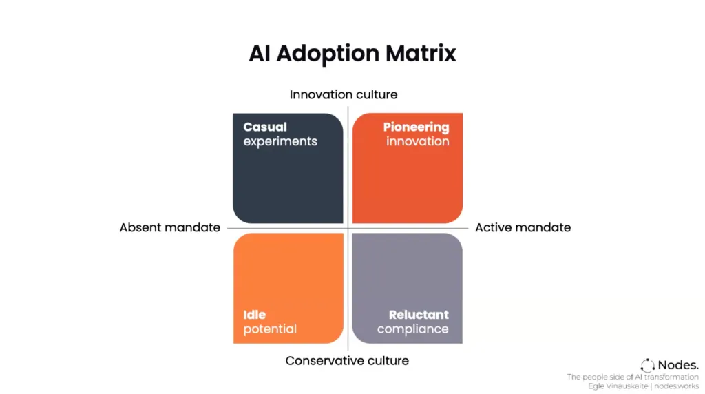 Her AI Adoption Matrix shows how these two forces combine: with neither, adoption stalls in idle potential; with only culture, it results in scattered casual experiments; with only mandate, it slips into reluctant compliance.