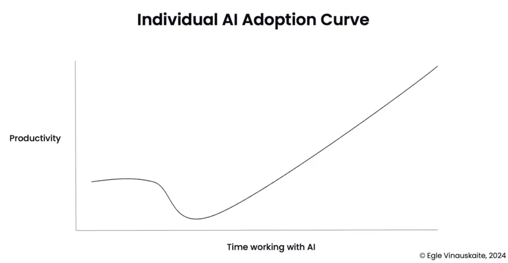 “Most assume AI adoption looks like this: you give people the tools, you show how to use them… when in reality, it works a bit like this,” Eglė said, pointing to the inevitable dip that comes when people are asked to change established workflows.