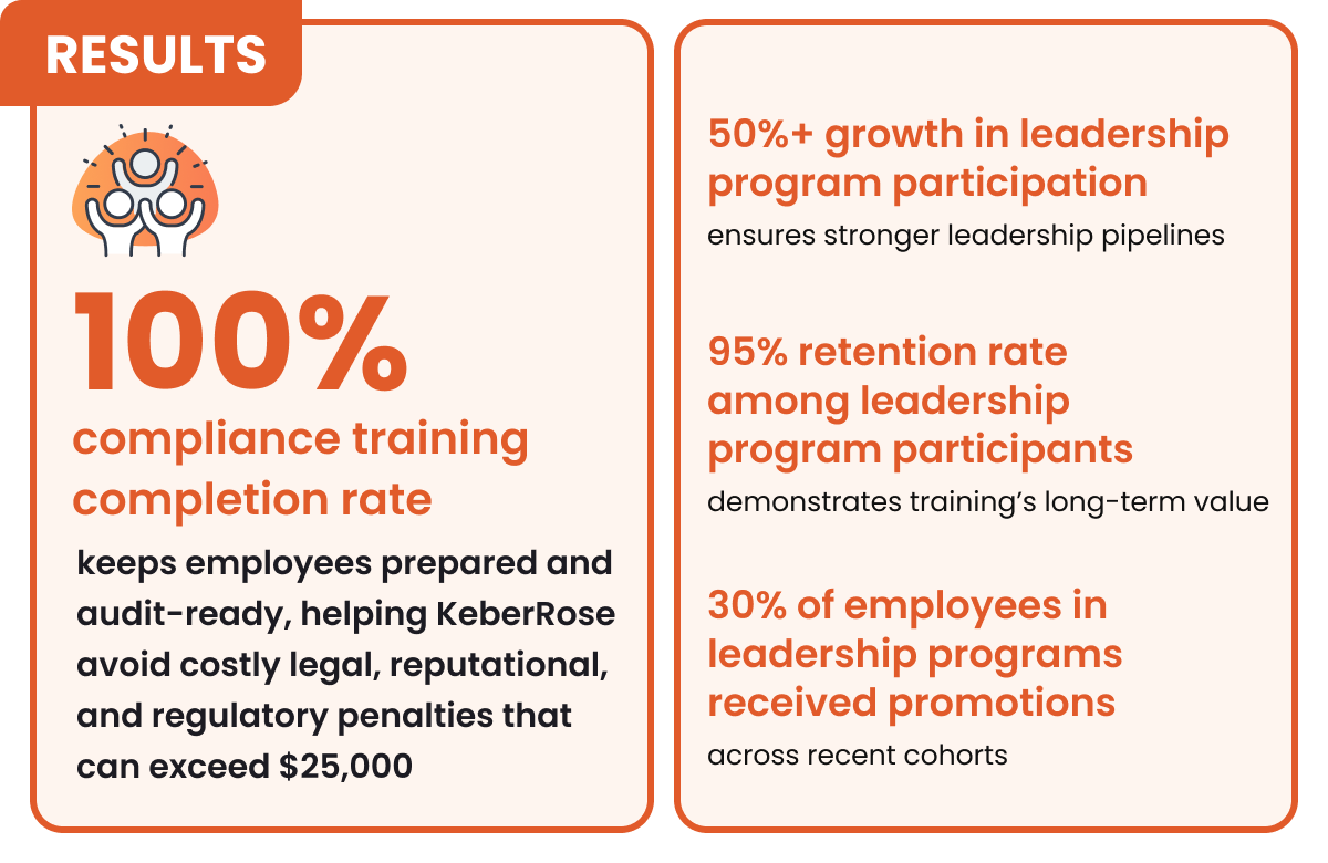 - 100% compliance training completion rate keeps employees prepared and audit-ready, helping KerberRose avoid costly legal, reputational, and regulatory penalties that can exceed $25,000