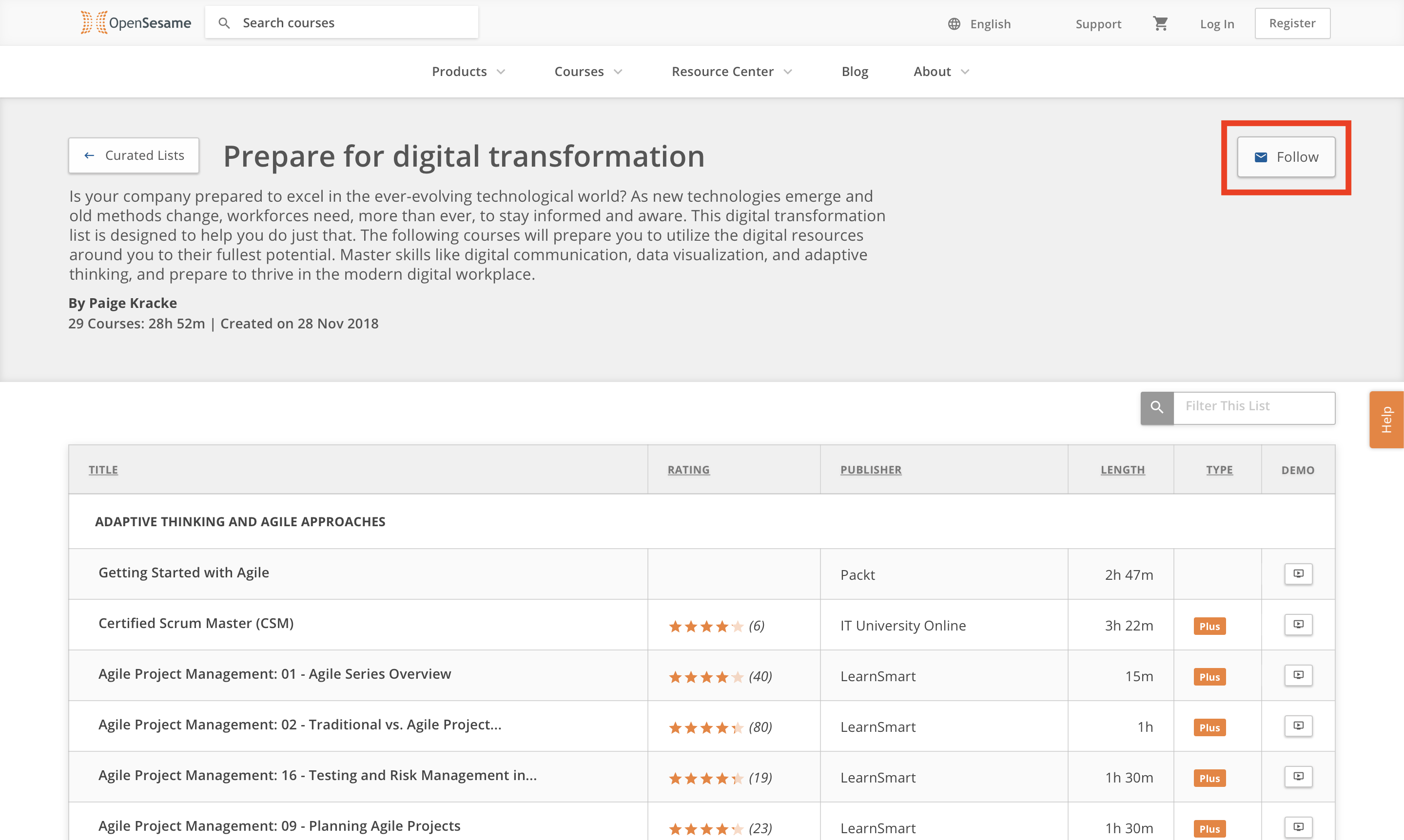 At a glance, you can see how many courses are in each Curated List and whether the courses in each List are included in our most popular subscription offering, OpenSesame Plus. Within each Curated List, you’ll be able to see additional information including course ratings, length, publishers, and (when logged in) you can view a course demo if one is available.