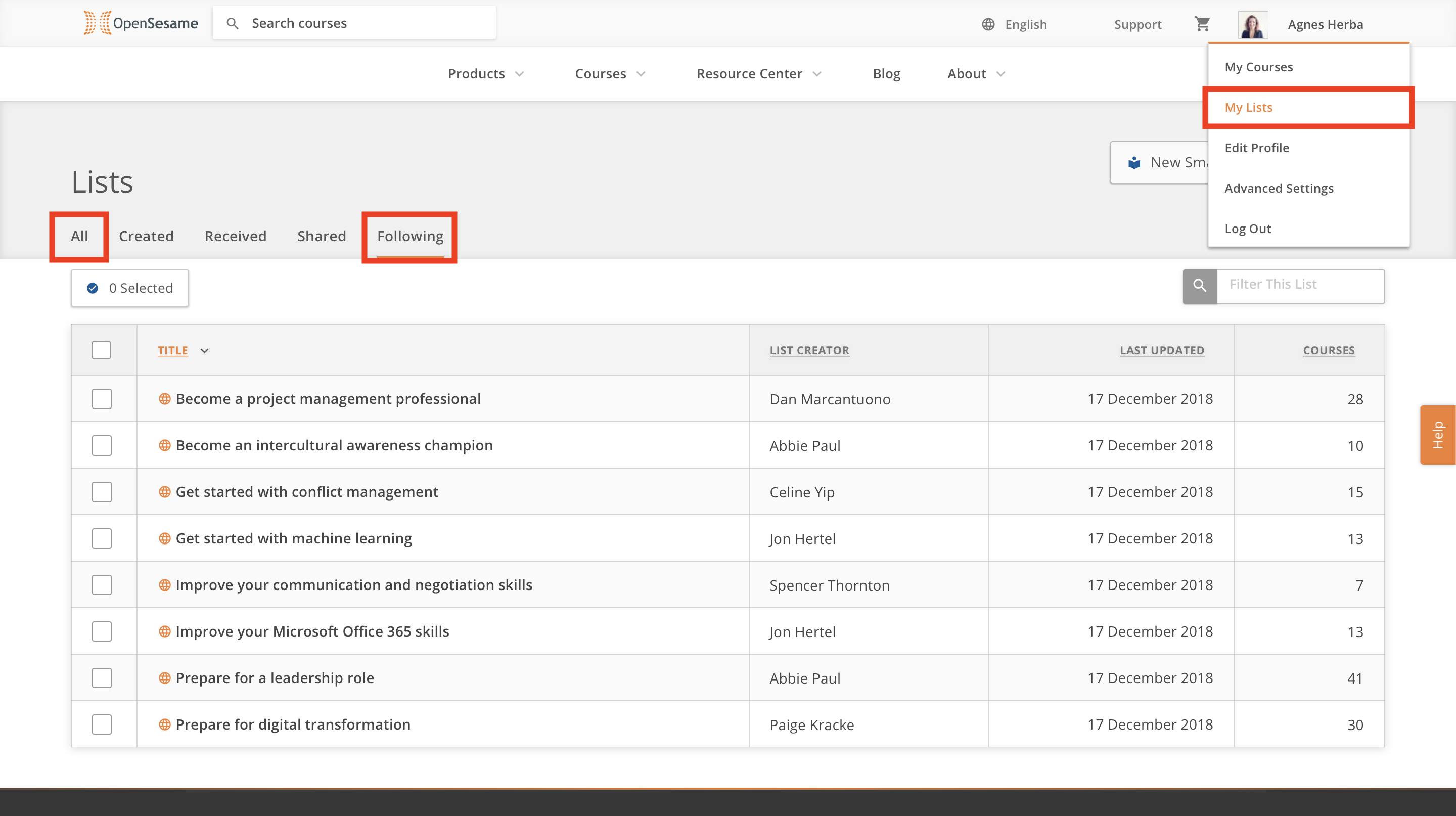 Log into your OpenSesame account or, if you’re new to OpenSesame, register to create one. You’ll see the Curated Lists you’re following within My Lists in the All tab as well as the new Following tab.