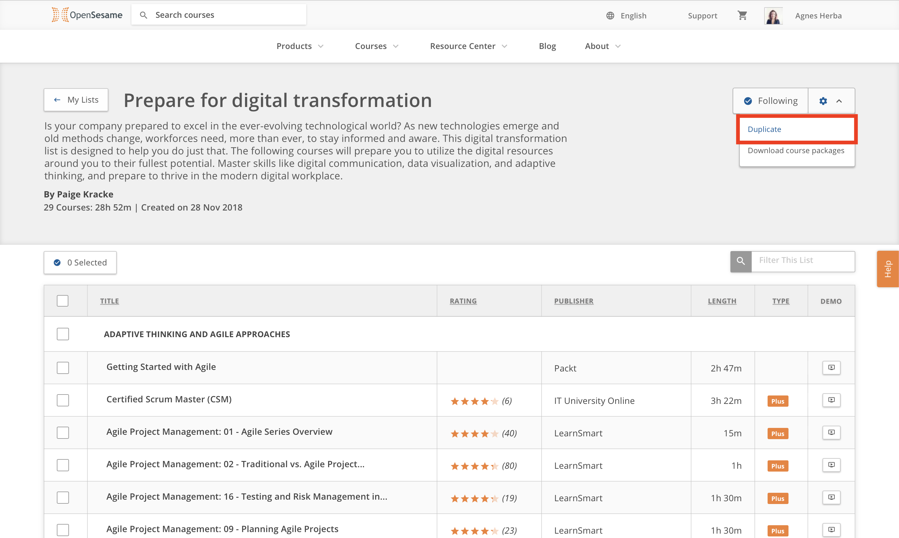 Need to make changes to a Curated List? No problem. Within the List, select Duplicate from the List settings menu (gear icon) to create a copy, enter a list title and description, and click Duplicate. Your new duplicated List can be found in the All and Created tabs. You can now add, remove, and organize courses as needed. Note that duplicated Lists will not reflect any course updates from OpenSesame.