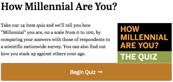 How millennial am I? Well, I scored a 96 on Pew Research Center’s “How Millennial Are You?” quiz. Apparently pretty millennial! Though I am most definitely part of the Millennial generation, I was surprised at how high my score was. As I read the multitude of reports about my generation in the workplace, I often find myself on the defensive, thinking “I’m not like that!” (I don’t spend all day watching TV, playing video games, or complaining about how I’m treated by other generations. I don’t think I’m particularly flakey or unreliable). It is important to remember that while we are a generation sharing some key characteristics, we are also individuals.