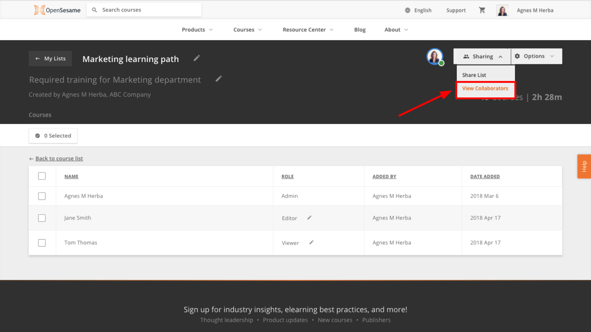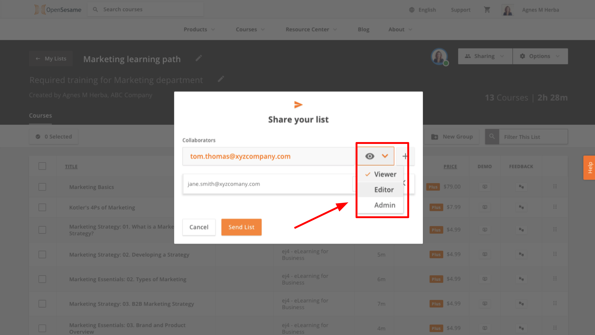 Admins and Editors have the same editing abilities including adding, removing, and organizing courses but only Admin users can remove collaborators from a list. All users, including Viewers, can see the courses within a list, provide feedback, and watch course previews. Additionally, they can download course SCORM packages and add them to their Sync cart (where applicable), but Viewers cannot change the overall list. All users can add new collaborators at their equivalent or lesser permissions level.