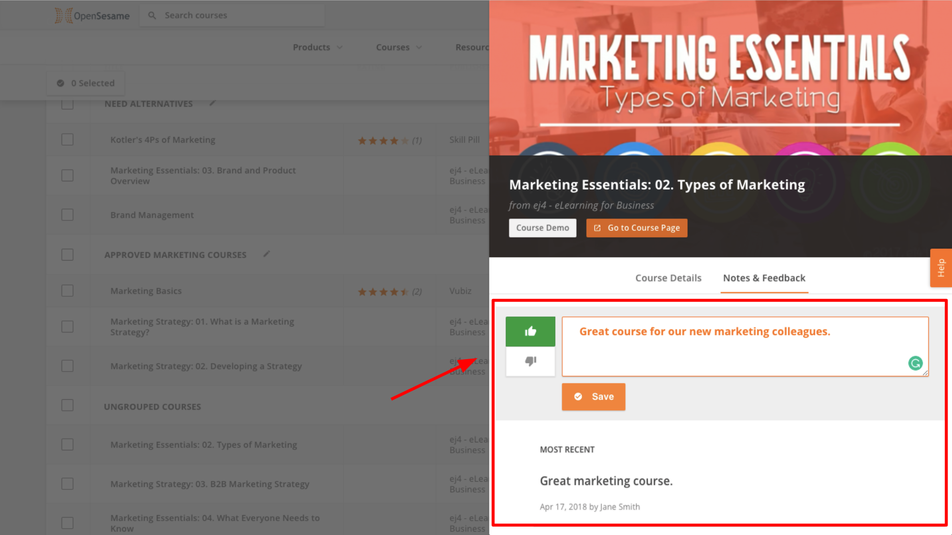 Each collaborator can provide a positive or negative feedback rating along with notes on each course within the list. The feedback and notes are visible to other collaborators and help to refine your course selections.