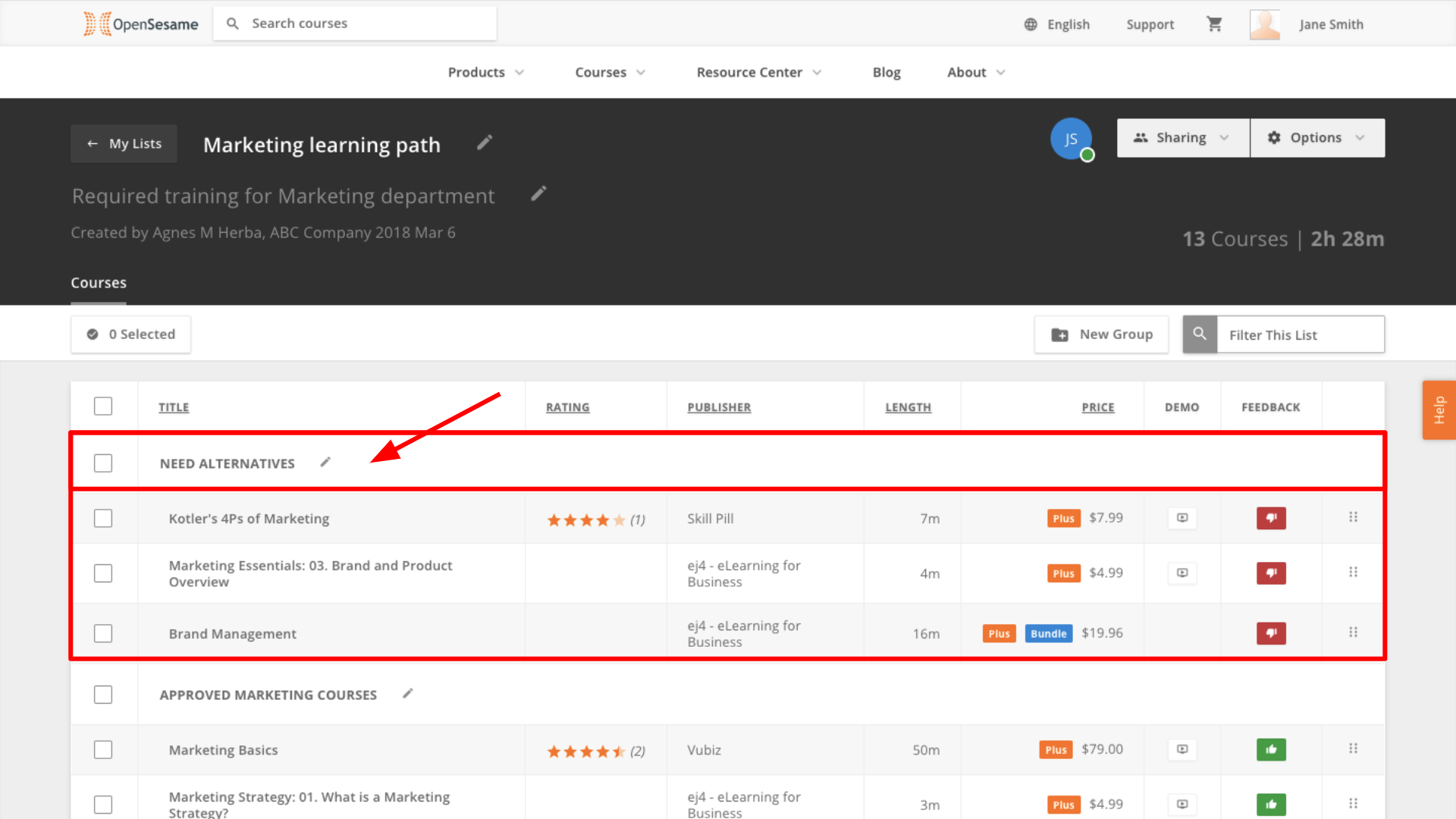 List Admins and Editors can use the feedback and notes provided by collaborators to decide whether the course is a good fit for the organization. You may want to consolidate courses that need to be replaced into a group like the “Need alternatives” example below. To create a new group, click the New Group button, enter a group name, and click the green checkmark. To reorder courses within groups, simply drag courses to the appropriate group using the move icon