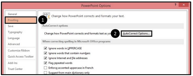 Step #2: Navigate to the AutoCorrect features in PowerPoint. In PowerPoint 2013 it is File → Options → proofing → and AutoCorrect Options.