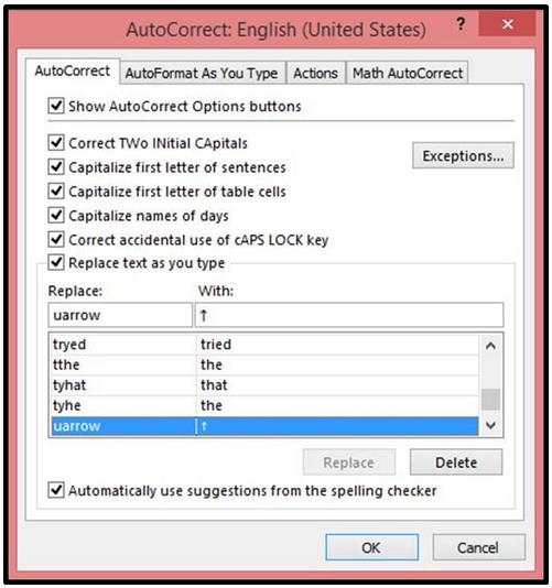 In the dialog box below, you can see I’ve typed “uarrow" for replace and inserted “↑” for with: