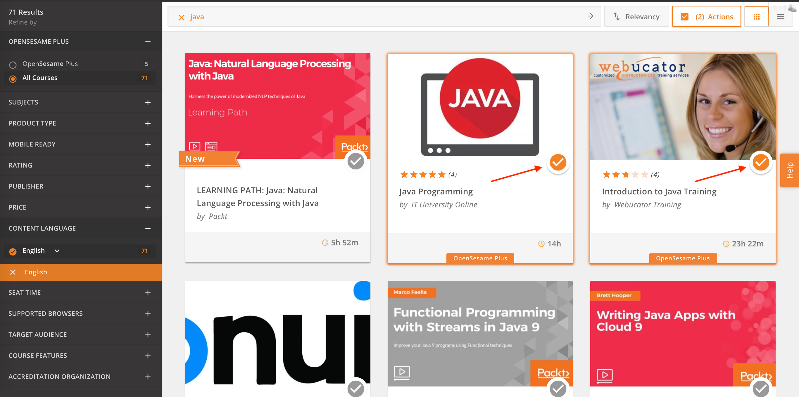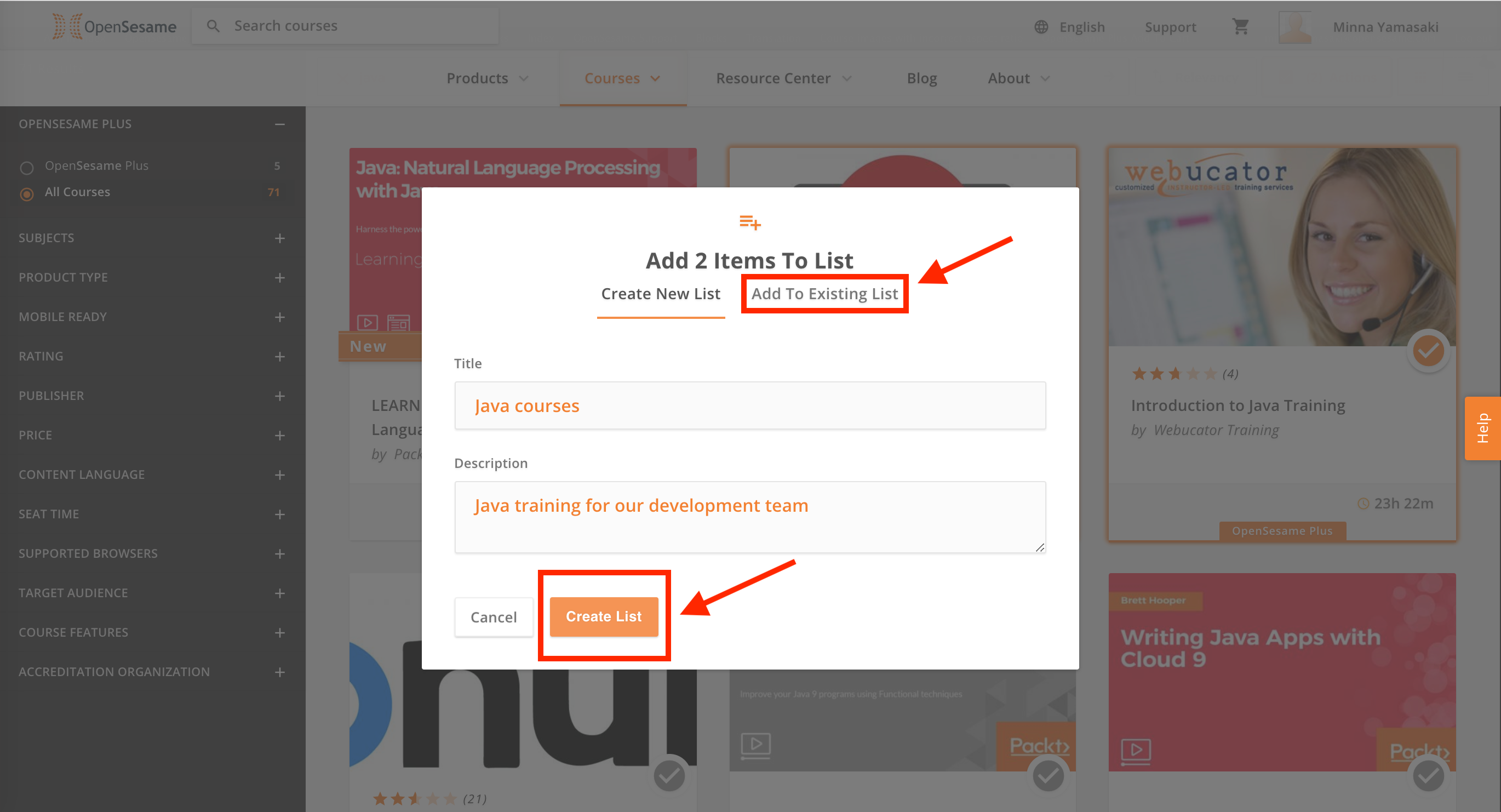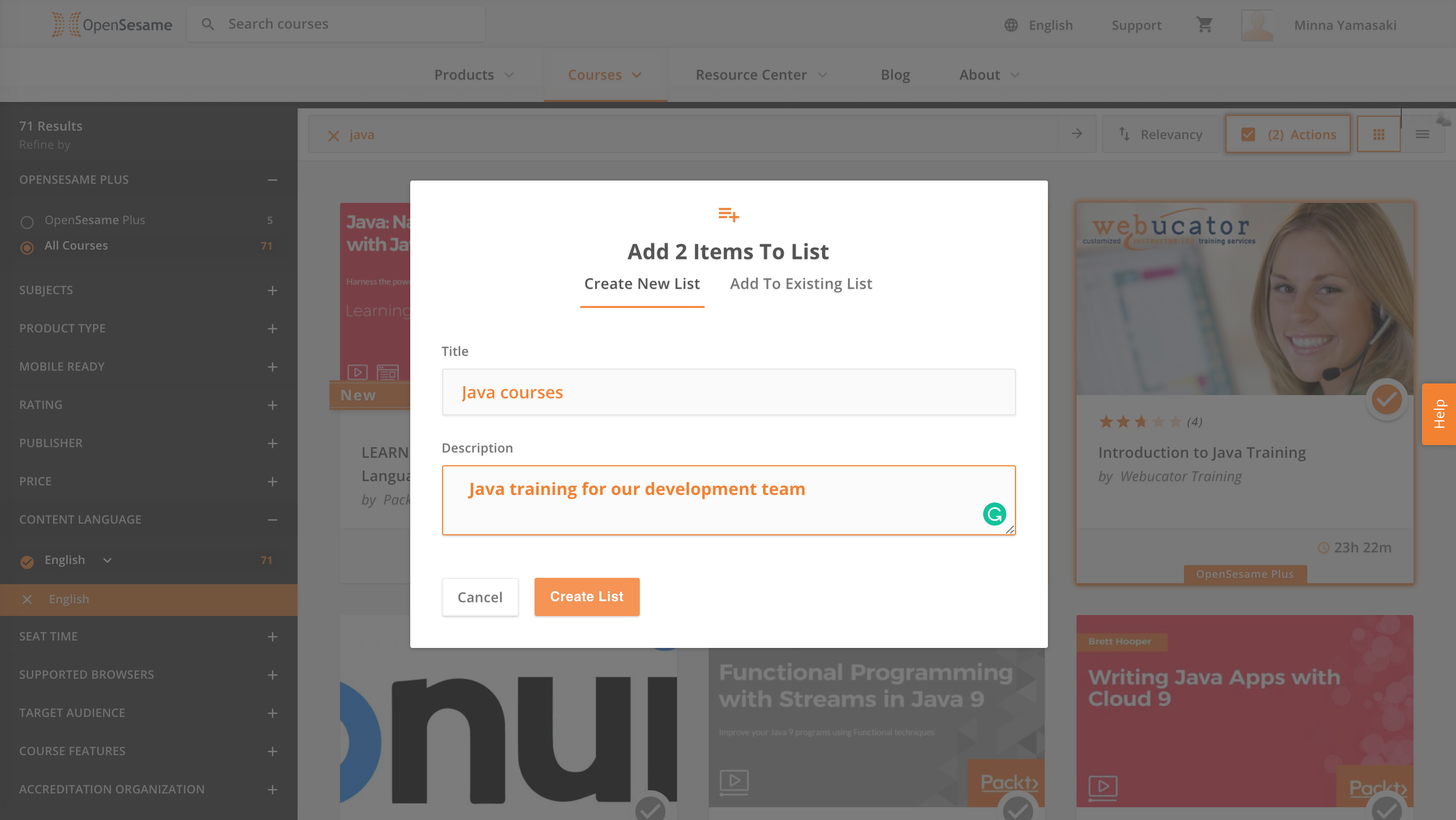 With OpenSesame Course Lists, it's never been easier to create and maintain curated lists of courses for yourself or your employees. You’ll be able to quickly and easily add courses to a list from OpenSesame Search and course pages, as well as group items within a list such as by job role, department, employee level, etc.