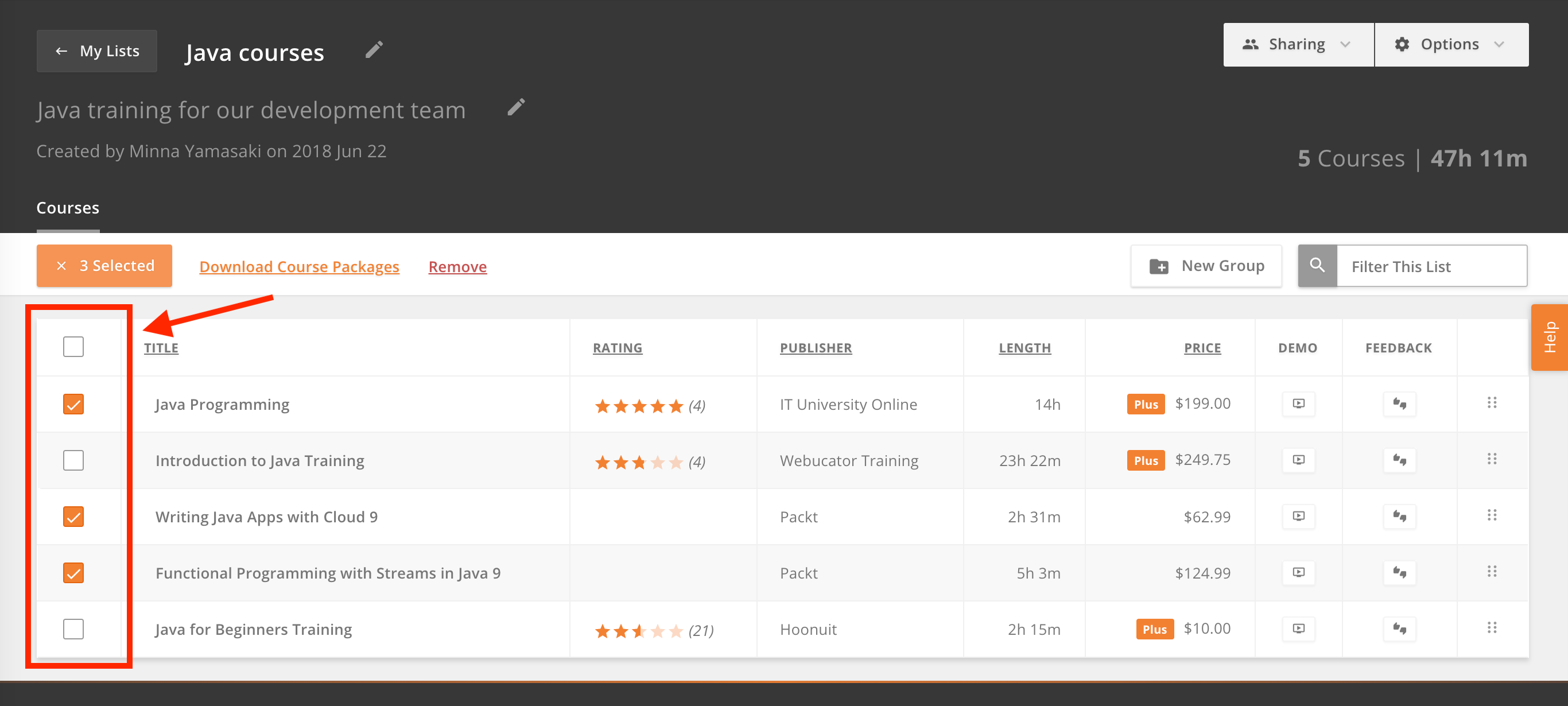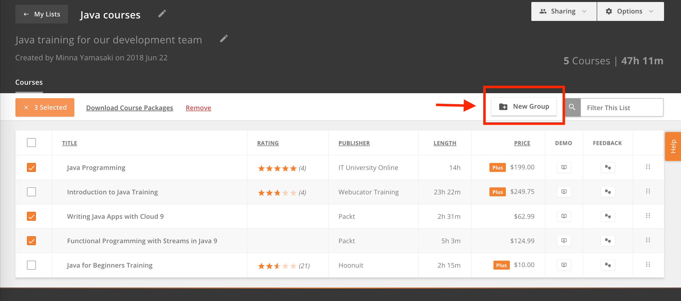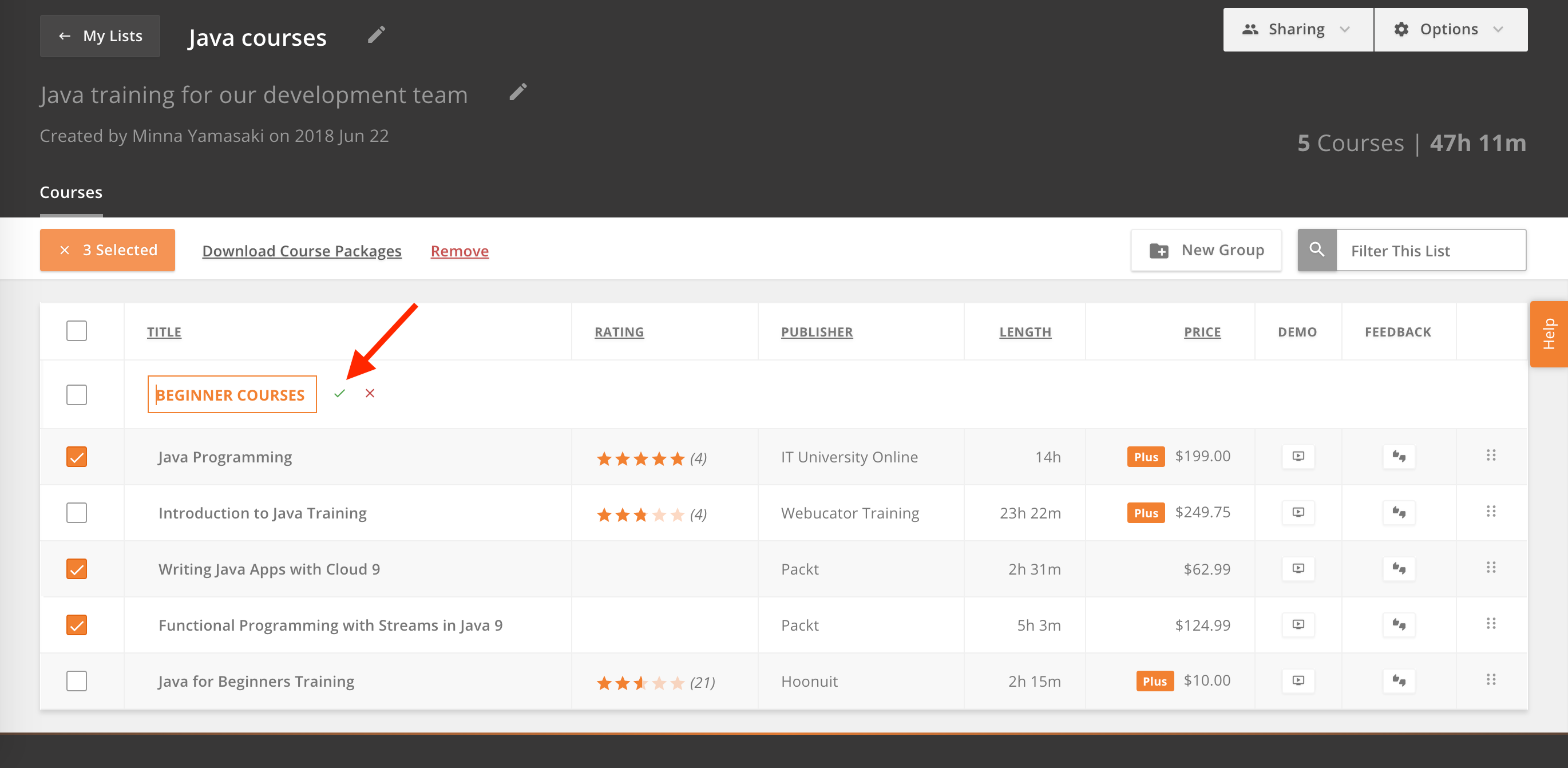 1. Select the courses you’d like to group together using the checkboxes on each row.